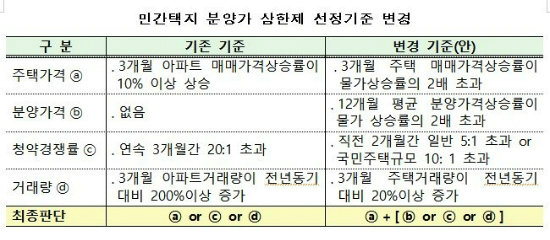 하지만 국회 답변에선 "주택시장의 투기과열이 심화될 경우 적극적으로 고민할 것"이란 전제를 달긴 했지만 "주택법 시행령을 개정해 민간택지 지정 요건을 개선하는 것을 검토하고 있다"고 기존 입장에서 한 발 더 나아갔다.